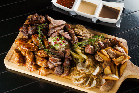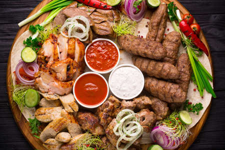 Close-up photo of mixed grilled meat platter. Beef, pork, poultry, sausages, grilled garlic, chili pepper, different sauces on marble background