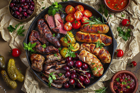 Traditional Azerbaijani Meat Platter with Sujuk, Veal, Chicken and Sausages Top View, Pickled Vegetables, Marinated Berries and Fruits in Vintage Pan, Generative AI Illustration