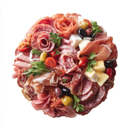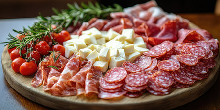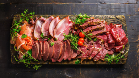 A stunning display of assorted cured meats on a rustic wooden board that showcases vibrant colors and textures perfect for culinary enthusiasts and food lovers.