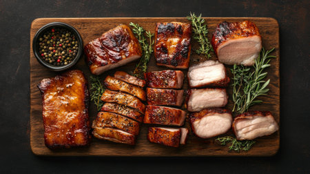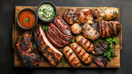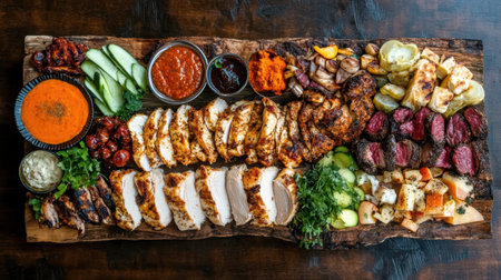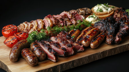 A beautifully arranged assortment of grilled meats on a wooden board, featuring rich flavors and vibrant sides, perfect for gatherings and celebrations.