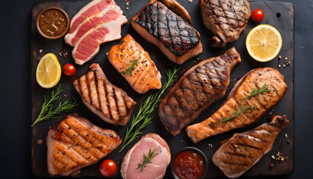 A gourmet steakhouse platter featuring prime cuts of beef, pork, and fish, cooked to perfection and served with decadent sauces and garnishes.