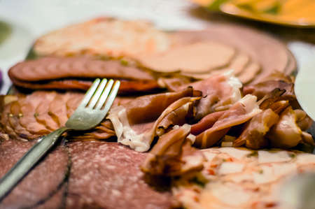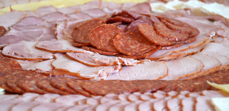 meat buffet table of cold cuts sausage and ham selection..