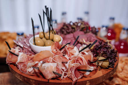 meat antipasti appetizer. different festive dishes on the table in the restaurant