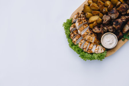 Most meat dish - beef kebabs, sausages, grilled mushrooms, potatoes, tomatoes and sauce. The best choice for a beer. Close up on a white background.
