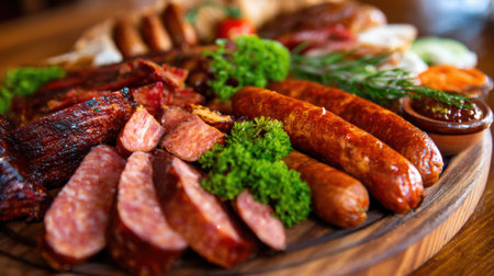 A close-up of a meat lover's platter with an assortment of cooked meats, including beef brisket, grilled sausages, and barbecued ribs, arranged on a wooden board.