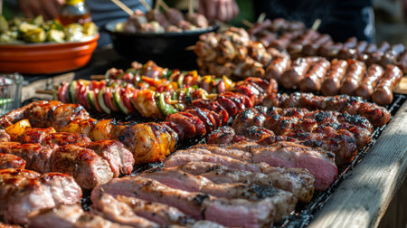 A vibrant display of assorted grilled meats and vegetables prepared for a summer barbecue. Perfect for gatherings, picnics, and outdoor cooking events.
