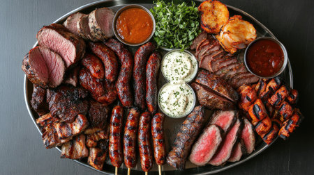 An overhead shot of a barbecue feast featuring a variety of grilled meats, including sausages, steak, and skewers, arranged on a large platter with dipping sauces.