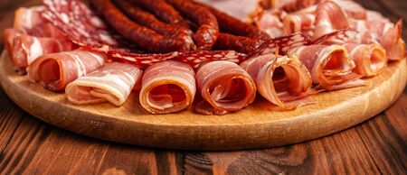 Assorted meat snacks on a wooden cutting board. Sausage, ham, bacon, smoked meats. Stock photo of meat products with blank space.