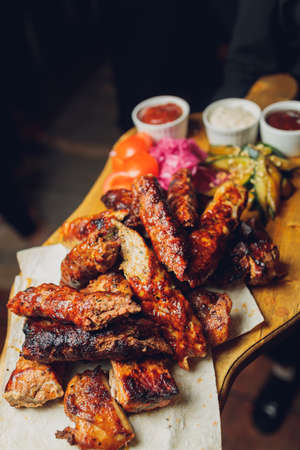 Meat set on a wooden board. Fried chicken wings, pork ribs, grilled vegetables, french fries. Beer appetizer with sauces. background image.