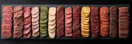 A visually striking arrangement of various gourmet meat cuts on a dark slate surface, accented with colorful garnishes and salt, ideal for culinary showcases and food photography.