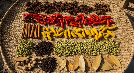 A large round wicker tray is filled with neat rows of various drying spices, including red chilies, turmeric, cinnamon sticks, cardamom, star anise, and peppercorns. The arrangement showcases the colorful diversity of culinary ingredients in natural sunlight.