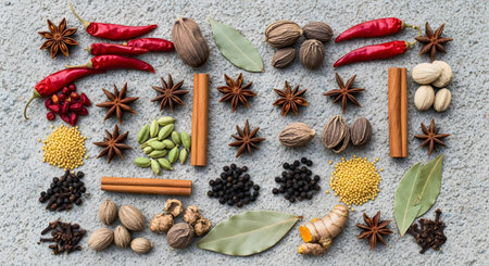 A neatly organized flat lay of assorted spices arranged on a grey concrete background. The collection includes red chili peppers, cinnamon sticks, star anise, nutmeg, cardamom, and peppercorns, showcasing a variety of culinary flavors.