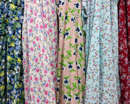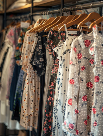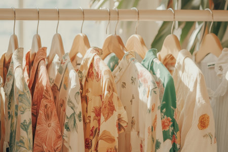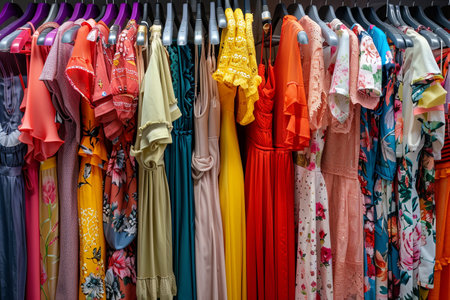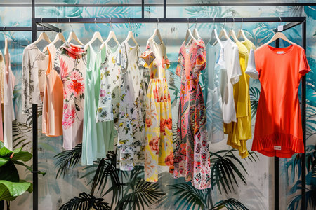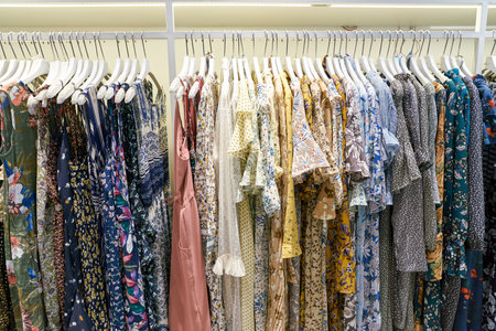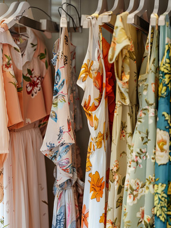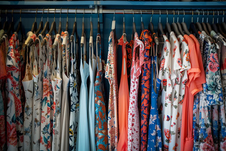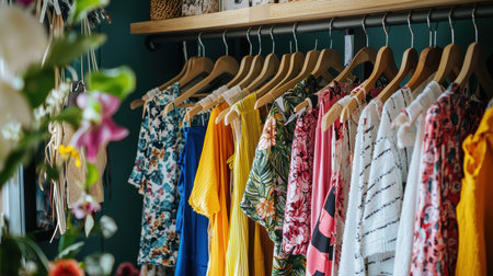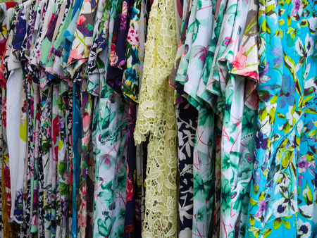 Rack of clothes hanging on a rail, showcasing summer dresses and shirts for a creative concept of a womens clothing showroom.