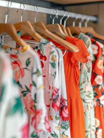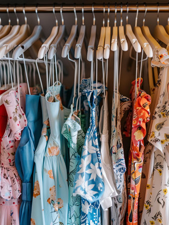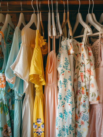 Fashionable womens closet wallpaper showcasing a variety of summer dresses and shirts hanging on hangers.