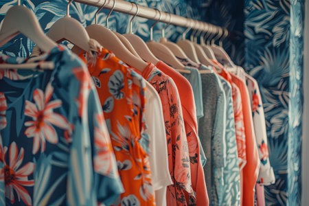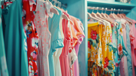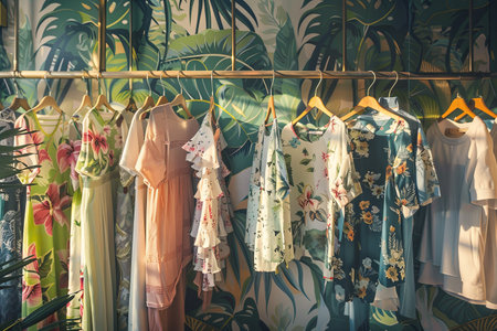 A fashionable womens closet wallpaper filled with summer dresses and shirts on hangers, showcasing a creative concept for a designer clothing showroom.