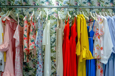 Various dresses hanging on a rack in a summer closet or designer dresses store, showcasing a fashionable womens clothing showroom.