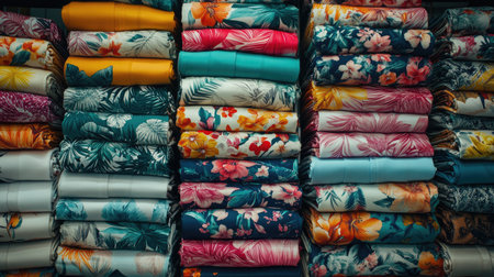 A vibrant collection of neatly stacked rolls of floral fabrics showcasing a variety of patterns and colors, perfect for creative fashion and d
