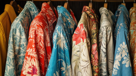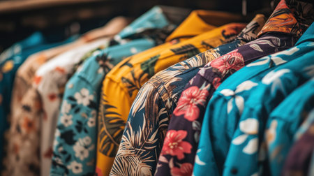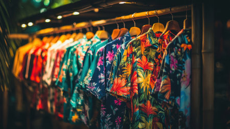 Vibrant array of colorful Hawaiian shirts hang on a rack, illuminated by warm light, showcasing tropical vacation fashion