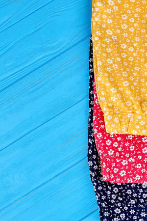 Baby clothing and copy space. Summer cotton childs colorful clothing in white flowers print, top view. Kids apparel on wooden shelf.