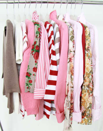 Display of fashionable shirts on hangers in a womens clothing showroom, part of a summer closet concept.
