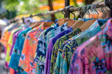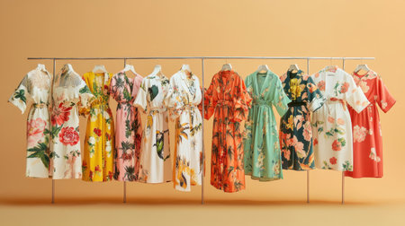Traditional holiday garments featuring vibrant floral patterns in spring colors are beautifully arranged on a display rack, showcasing their summer-inspired hues.