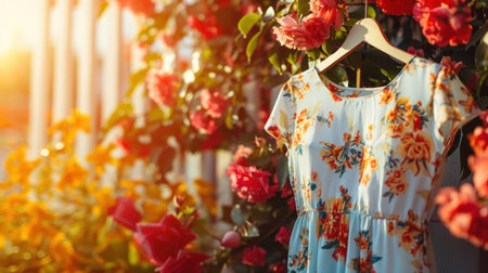 An eye-catching floral dress mockup displayed against a bright, sunny background, appealing to spring and summer fashion lovers, --ar 16:9 --v 6 Job ID: d336e36f-fec1-4c84-b718-8ca72f6c54b5