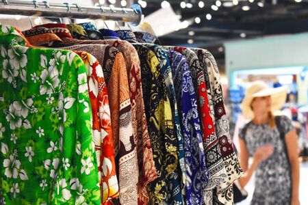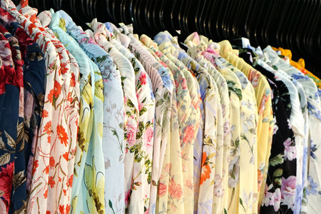 Clothes on hangers in store. Womens floral blouses hang on clothing rack. Shopping time concept