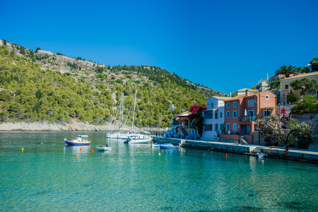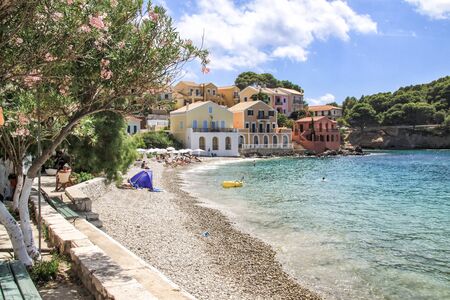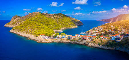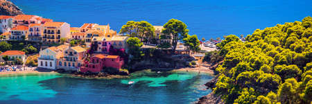 Amazing coastline with colorful houses under sunlight. Wonderful summer seascape with perfect blue sky of Ionian Sea. Assos village. Kefalonia. Greece.