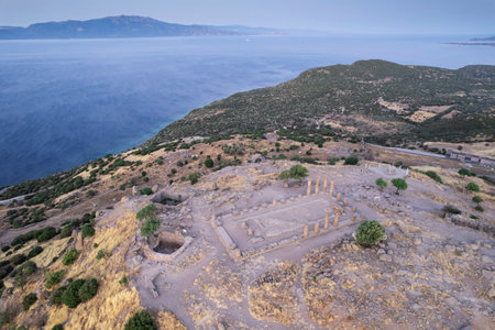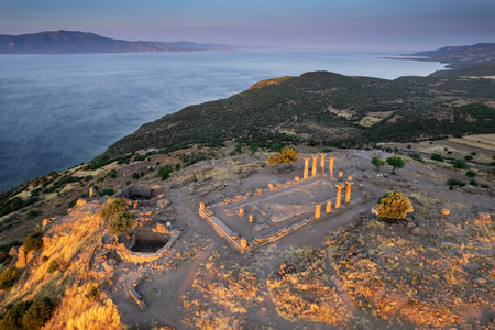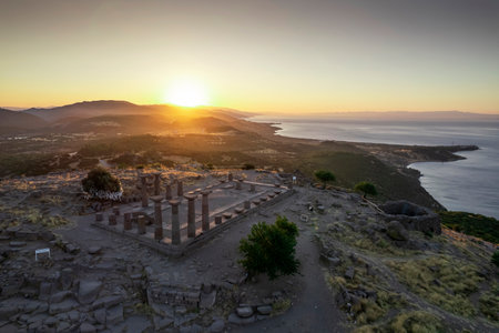 The Temple of Athena ruin in Assos Ancient City. Panoramic view Drone shots. Canakkale, Turkey.