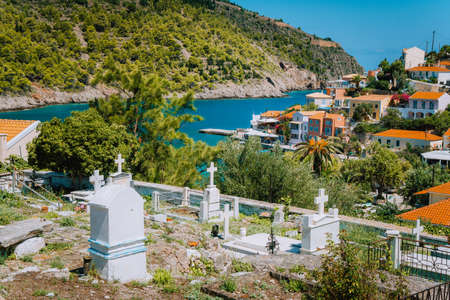 Beautiful landscape with old cemetery near picturesque town Assos, Kefalonia, Greece. Stunning amazing charming places, famous town