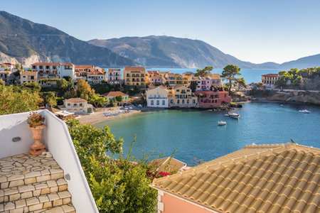 Picturesque Assos village overlooking tranquil turquoise Mediterranean sea in Kefalonia, Greece