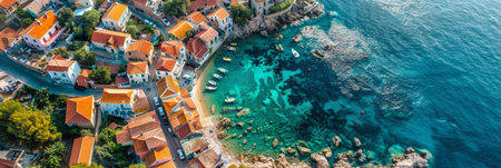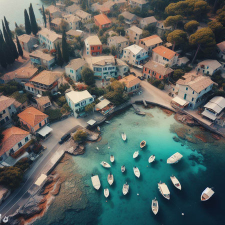 a drone view of a picturesque coastal village with colorful houses and clear blue water