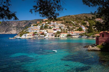 Cute blue sea bay in front of Assos village. Beautiful view to vivid colorful houses near blue turquoise colored transparent bay lagoon. Kefalonia, Greece.