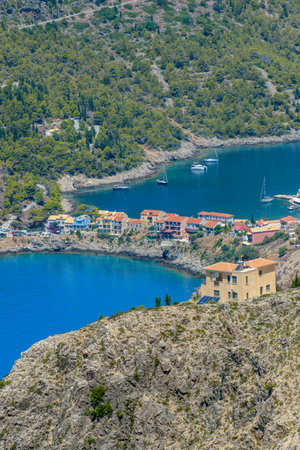 Assos village in Kefalonia, Greece. Turquoise colored bay in Mediterranean sea with beautiful colorful houses in Assos village in Kefalonia, Greece, Ionian island, Cephalonia, Assos village.