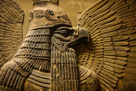 Ceremonial Ancient Assyrian relief sculpture. Historical archaeology stone carved statuary. Generate ai