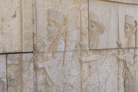 Bas-relief depicts guards - warriors of king. Ancient relief on the wall of the ruined city of Persepolis. Iran.
