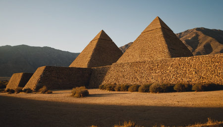 Pyramids of Giza in Egypt. Ancient Egyptian pyramids at sunset
