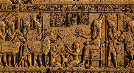 A detailed stone relief carving from an ancient civilization, likely Assyrian or Mesopotamian. The frieze depicts a king on a throne receiving offerings, surrounded by warriors, horses, and subjects, with a band of cuneiform or hieroglyphic text above. The artwork captures the power, history, and artistry of an ancient empire.
