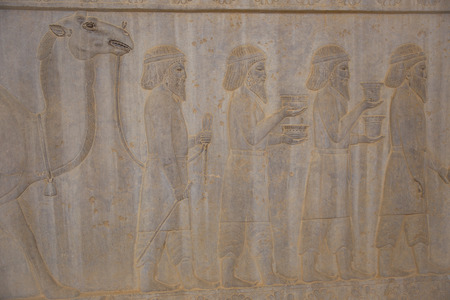 Bas-relief depicts ambassadors, bearing gifts to the king. Ancient relief on the wall of the ruined city of Persepolis. Ancient Persia. Iran.