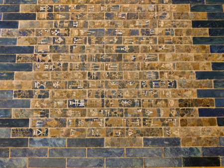 Berlin, Germany - July 7, 2022: Brick wall with cuneiform writing on The Ishtar Gate.