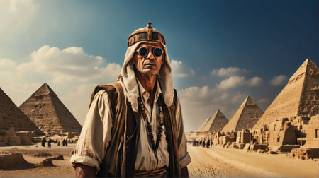 An AI illustration of a man in goggles standing in front of pyramids.