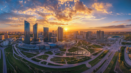 Panoramic aerial view of Astana (Nur-Sultan), Kazakhstan, bathed in the warm light of sunset, capturing the city's modern skyline and architectural