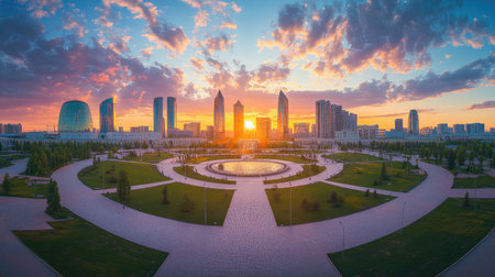 Stunning panoramic sunset view of Astana (Nur-Sultan), capturing the essence of Kazakhstan's capital with its modern structures and