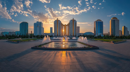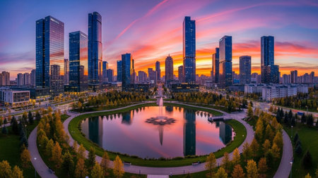 A panoramic view of a modern city skyline at sunset, featuring a circular park with a pond and fountain reflecting...