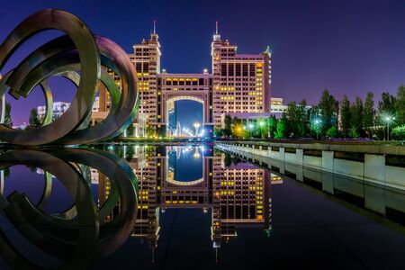 Nur-Sultan Astana, Kazakhstan, 15 august 2016: reflection of the night city in the fountain.