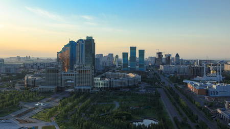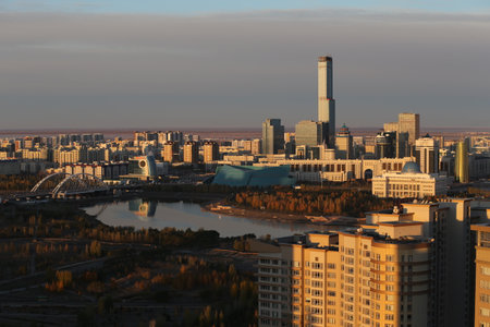 Sunset panorama of Astana (Nur-Sultan), Kazakhstan, showcasing the city's iconic buildings and urban landscape in a