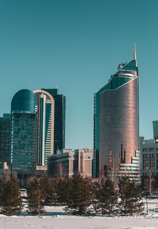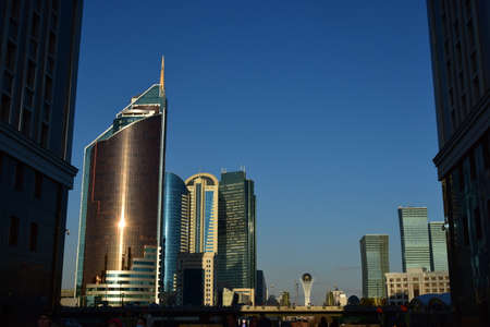 ASTANA, KAZAKHSTAN - FEBRUARY 14, 2019: View on cityscape buildings in sunset light with the blue sky background