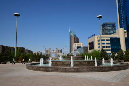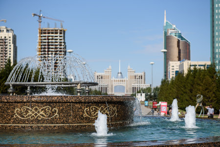 Fountain in Nur Sultan in the summer, In the background are skyscrapers. Sunny summer day.