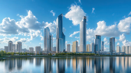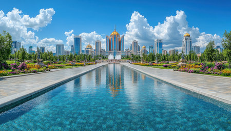 Reflecting pool reflects the modern buildings of nur-sultan, kazakhstan on a beautiful day