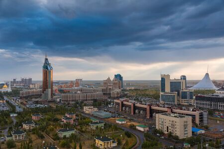 Panoramic view of modern architectural urbanistic city Astana. Aerial cityscape view of beautiful landscape of futuristic buildings, gold tower on natural background, Astana, Kazakhstan